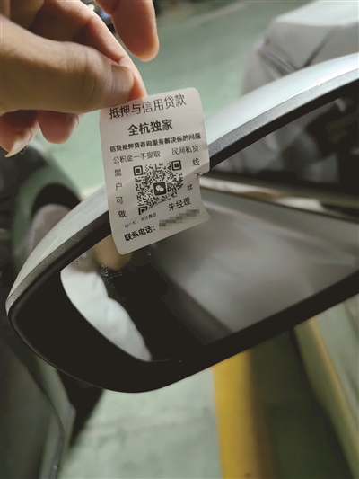 半小时后,等记者转了一圈回到自己的车前,发现后视镜上被贴了一张小广告——黏性很强,撕下来镜片上还是会留下部分白色黏液,用湿巾纸用力擦才能擦除。