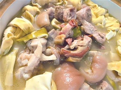 建议大家做“金银蹄”的时候,火腿踵不要放太多,1-2块就行,这样整锅汤就已经很咸鲜入味了,不需要额外撒盐,也可根据自己的口味加一些吸味的素菜,比如千张结、千张丝等。橙友“桂花酒酿”就用了这样的搭配:“三伏吃只金银蹄——咸脚爪、新鲜猪爪、临安笋干,咕嘟咕嘟炖一锅,怕汤油,家里正好有千张结,也一起炖了,鲜!”