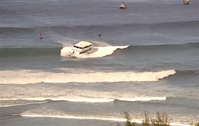 9日上午8点左右,美国夏威夷海滩的潮水涨平并开始退潮,一艘游艇大小的客船被冲上海滩搁浅,它在大浪中摇晃倾斜,几乎翻船。