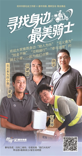 近日,杭州市委社会工作部联合都市快报、橙柿互动共同推出“小哥群英荟——寻找身边‘最美骑士’活动”。邀请大家推荐身边“助人为乐”“见义勇为”“拾金不昧”“文明骑行”“参与治理”的骑士小哥,为他们点赞。