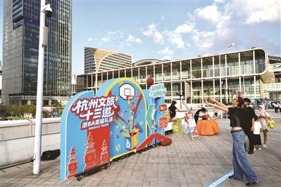 球场外的杭州文旅“十三邀”浙BA荣耀礼遇的投篮互动点、海报展墙前也是人气超旺。体育馆场内,篮球声浪震耳欲聋;赛事场外,文旅热潮熙攘涌动。浙BA城市争霸赛揭幕战之夜,杭州的热烈氛围因篮球而点燃。