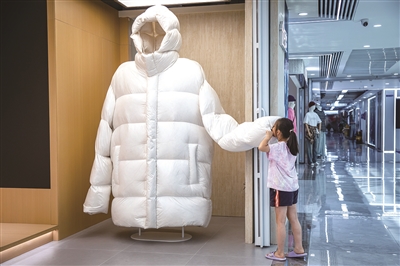 E7杭州时装中心,一个小女孩对服装店门口展示的超大羽绒服样衣充满好奇。