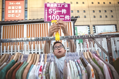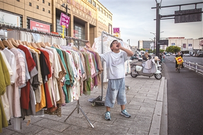 傍晚时分,位于九堡的杭州国际服装城门口,9岁的段建芃在路边大声吆喝,帮爸爸摆摊卖衣服。
