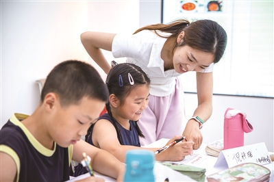 在九堡街道数字时尚产业社区举办的夏令营上,杭州师范大学的志愿者结对陪伴、辅导孩子们。