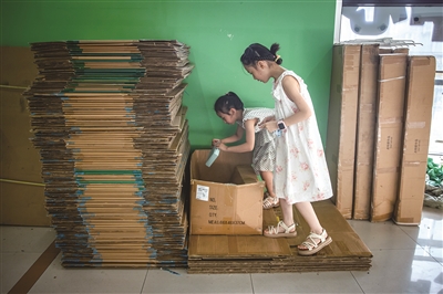 杭州国际服装城,两个小女孩在闲置的纸箱里翻找,之前她们刚找到一枚硬币。