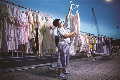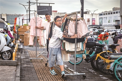 傍晚6点,市场里的店铺纷纷收摊关门。段建芃和爸爸,一人推着一个挂衣架,走出市场,准备去门口的路边摆摊卖女装。
