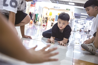 杭州国际服装城,张浩宸和小伙伴在玩“弹棋子”游戏。