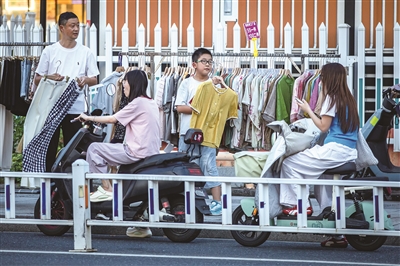 “一件55,两件100,清仓大甩卖,快来看一看!”段建芃拿着衣服,在路边大声吆喝。一位姑娘停下电瓶车,一边挑选一边砍价。“都是批发价,已经是季末清仓,不能再便宜了。”段建芃没让价,最终这单生意还是做成了。
