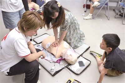 心肺复苏培训环节是活动中的重要部分。在专业人体模型前,家长们轮流进行胸外按压练习,孩子们则在一旁认真数着按压节奏。“1、2、3……”清脆的童声与按压的节拍此起彼伏。AED操作培训采用情景模拟方式,家长和孩子共同完成了从开机到贴电极片的完整流程。