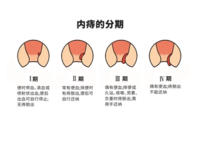 Ⅲ度痔主要表现为排便时痔块脱出肛门,或在咳嗽、用力等腹压增加的情况下也会脱出肛门,且不能自行回纳,需要用手推回肛门内;IV痔则更为严重,痔块基本上都脱出于肛门外,即使用手勉强推回肛门内,也会随即脱出。