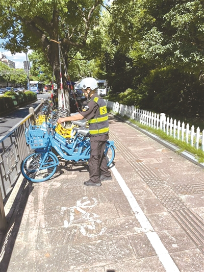 橙友“vQbdXrRz”在橙柿互动“橙柿直通车论坛”发帖:为古荡城管中队点赞——文三西路北侧浙江建投大厦附近的人行道经常乱停电动车和共享单车,最近西湖区古荡城管中队除加强教育外,队员还动手将违停车辆搬到指定区域内。