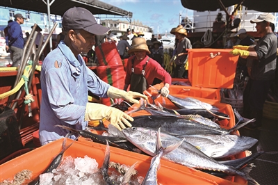 8月21日,在海南省文昌市清澜渔港码头,渔民忙着卸货。8月16日南海伏季休渔期结束后,海南出海渔船已陆续满载而归,丰收的喜悦溢满码头,大批新鲜海产品源源不断供应市场。据新华社