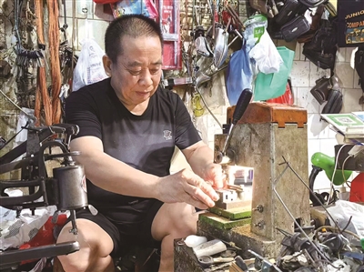 我看看不对了,刚好碰到有个老乡补鞋子,他叫我补鞋子,我想想对的,觉得补鞋子蛮好的。我们那边补鞋机器有得买,温岭产的。我买好机器,学好了,就跑出来,跟着工程队,做了大概几个月。