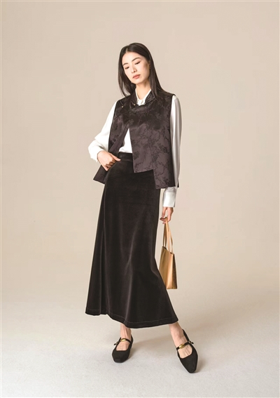 水物语新中式马甲 这是凯喜雅开发的第一款丝羊毛蝴蝶缎单品,秋季首发。70.8%绵羊毛混织29.2%桑蚕丝,兼具保暖、透气与丝滑质感,结合凯喜雅独创的数字织造技术。