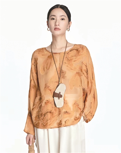 云山墨圆领长袖上衣 面料采用传统真丝剪花工艺打造立体肌理,结合精准数码定位印花技术,配合渐变晕染的油画色彩,呈现出媲美浮雕艺术的立体光影效果,既保持真丝柔滑触感,又赋予织物多维度的艺术表现力。