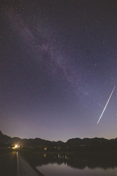 网友小丁在临安横岗水库附近意外拍下了这奇妙的一幕。小丁说自己是去拍北极星的,流星一瞬间就过去了,最开始还没注意到,直到水面上很亮,他才抬头看到。“是黄绿色的,持续了一两秒,然后就燃尽了,最后散开的时候就是纯绿色,超级好看!”