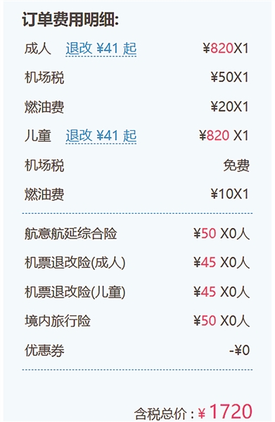 余女士在平台购买从福建厦门到四川成都的机票时,成人票为3折左右,儿童票直接是5折,比成人贵。余女士搜索官网发现,官网直接出的儿童票价格就是成人票的价格,燃油费和机场建设费也是按照儿童票减免的。