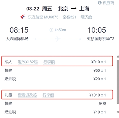 消费者多次反馈后,记者再次搜索多家机票预订平台,发现大部分儿童票已经可以和成人票一样享受更优惠的折扣,不仅限于5折票。但仍有部分航班会显示儿童票价高于成人票价,比如北京飞往上海某航班成人票最低910元,儿童票却要1010元。