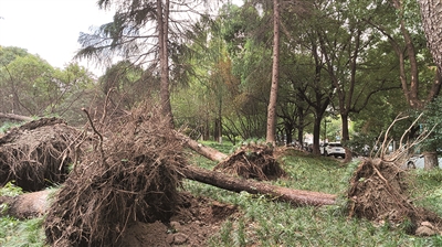“这个是雪松,根扎不深的。”一位工人师傅说,现场倒伏的大树,基本都是雪松,又高又粗。