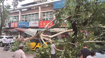 “没见过这么大的风!整棵树‘咣’的一声倒下来,吓都吓煞。”大树旁一家店铺老板说,不光这棵树,自家雨篷也有损伤,整条街上都是吹落的树枝树叶。