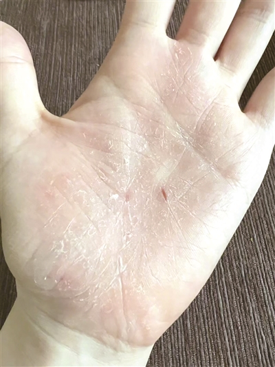 手掌脱屑出血、额头血管突起