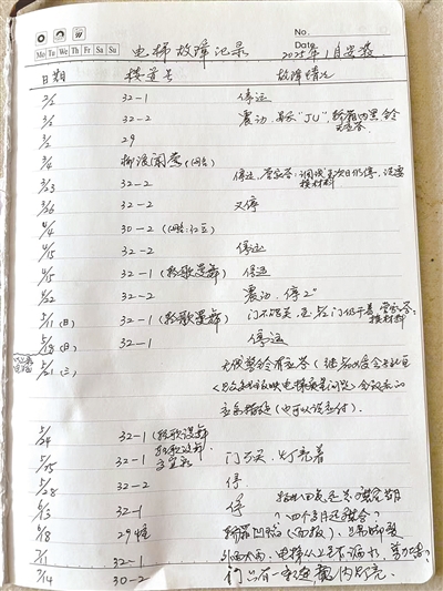 “后来每次有邻居在群里反映电梯故障问题,我都会记录下来,一直记到了7月17日,整整记了一页纸,大部分问题都是故障停运。2单元的电梯,3月23日停运,管家说是调试,3月24日还在停运,又说要换材料,3月26日又停运了。1单元的电梯,5月11日门不能关,5月12日门还是开着,管家说换材料,5月18日又停运……”