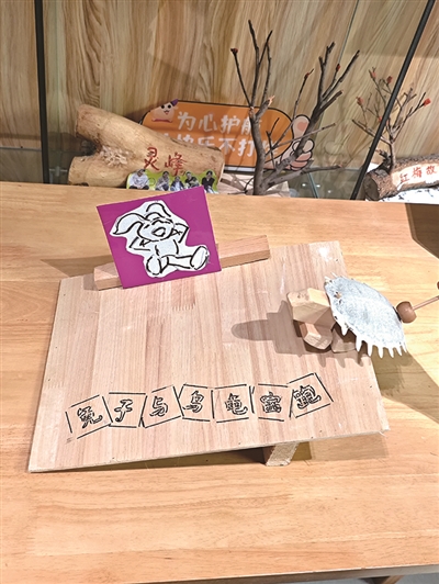 还有一次,一个孩子拿来一只甲鱼壳,说能不能让它动起来。庞大伯在“木牛流马”玩具的基础上,将甲鱼壳装饰上去,活生生一只小乌龟,惟妙惟肖。庞大伯还由此开发了一节课程,还原“龟兔赛跑”的寓言故事——画了只兔子靠在终点附近跑道,示意“兔子睡着了”,乌龟从起点一步一步,率先爬到终点,最终赢得了比赛。