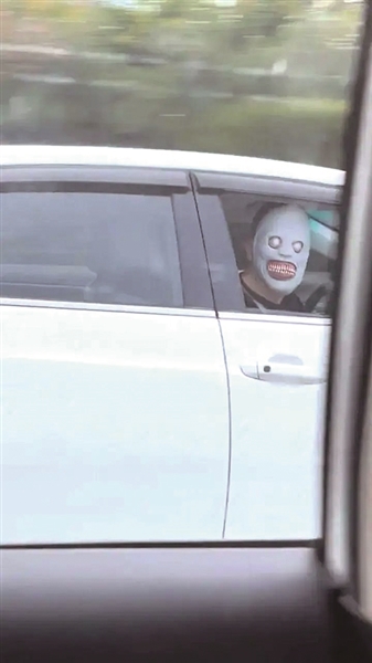 网传视频显示,两辆车同向行驶,其中另一辆车副驾驶上突然出现戴面具的人,当时,戴面具的人开着车窗微微起身看向过往车辆,然后将车窗全部摇下又转头注视。
