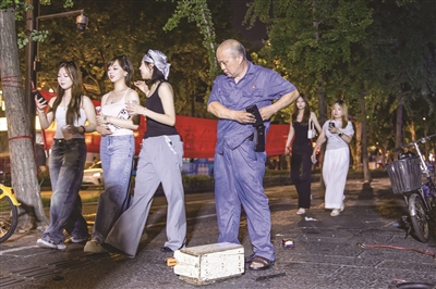夏日的周六夜晚,中山北路屏风街路口人来人往,热闹非凡,义务修车间隙的孔胜东,难得起身接了个电话。