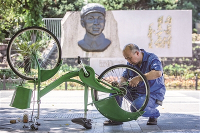 周六上午,孔胜东在吴山广场上的“雷锋广场”义务修车。