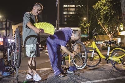 周六晚上,一位前来修车的市民为孔胜东摇扇降温。