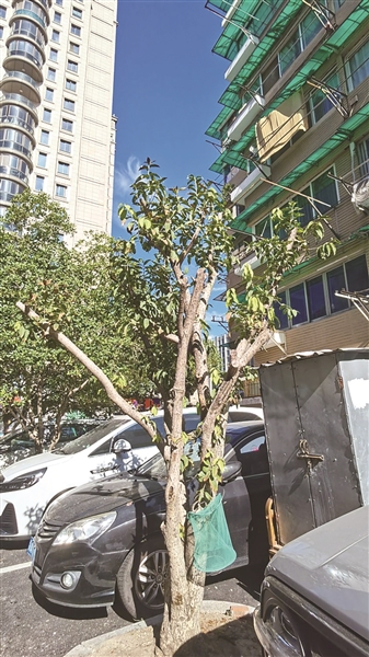 昨天下午,橙柿直通车记者来到双菱新村,在五幢前看到了橙友提到的这棵金桂。桂树不高,枝叶稀疏,但顶部的叶子均为绿色,看起来并没有枯死的迹象。
