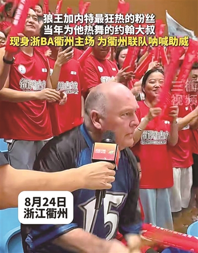 8月24日,衢州队坐镇主场衢江区体育馆对阵苍南队,最终58∶69不敌对手。但有球迷发现,助威阵营里有一人“刷爆”了视频圈。他就是和NBA球星凯文·加内特(Kevin Garnett)有着12年球迷情缘的“约翰大叔”。