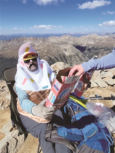 美国科罗拉多州休伦峰山顶上,日前出现了一个打扮成冰淇淋筒的人,在那里向徒步旅行者分发冷饮,被徒步者称为“传奇乳品”。