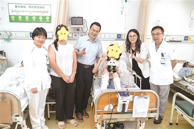 市一医院党委书记童向民(左三)、党委副书记宋醒(右二)和吴昊主任医师(右一)、朱艳丽护士长(左一)看望重获新生的诺诺