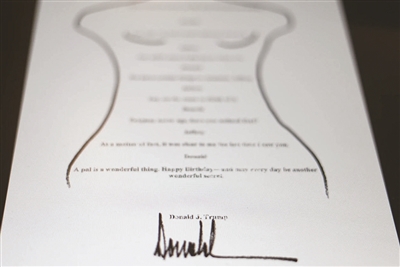 这封信包含以一名女性身体轮廓为边框的打印对话文字,特朗普在信中称爱泼斯坦为“哥们儿”,信的结尾写道:“生日快乐——愿每一天都是另一个美妙的秘密。”文字最下方中间部位有一个锯齿状的“Donald(唐纳德)”签名。