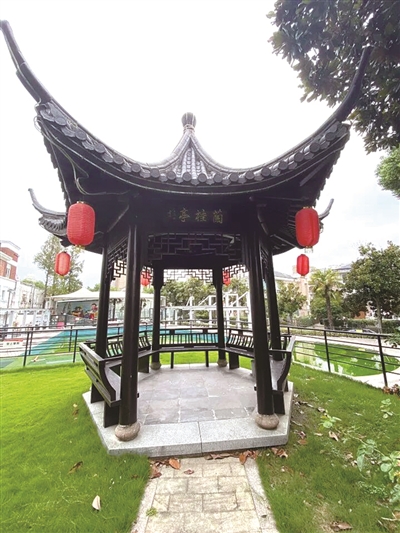 泳池旁边有个兰桂凉亭,黄丽雪说,本来下面是个废弃的生活水箱,后来老周建议改成活动室,才有了这个凉亭。