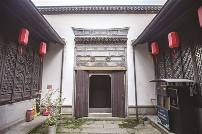 宅子占地2500平方米,四开间三进加天井,分中、西两条轴线。和院子里阳光充足的吴宅相比,梁宅就阴森幽暗了许多,整体布局紧凑有序,深宅大院的感觉扑面而来。如今从天井里抬头望,二层屋顶环绕,划出的一方天空,不只能看到蓝天白云,还有带着玻璃窗和电梯的现代化住宅“强势入镜”。