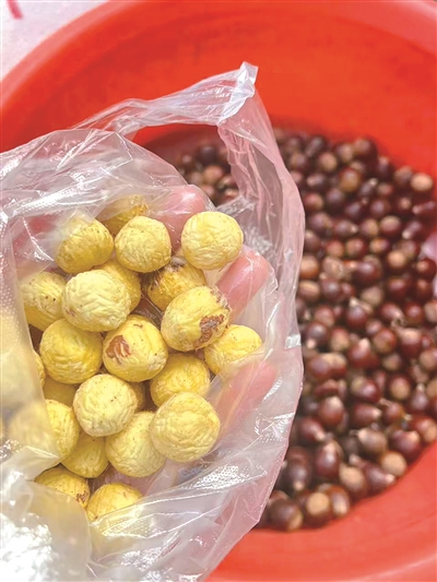 老板娘一边吆喝“野生板栗15元一斤”,一边说“免费剥壳”。听到“免费剥壳”四个字,有人眼睛就亮了,停下脚步,问:“还帮忙剥壳?”老板娘指指身后的一台机器,说:“一分钟,帮你剥好。”只见她称了一斤栗子,打开盖子倒进机器,不一会儿栗子壳和里面的那层“毛衣”就纷纷脱出,一颗颗剥好的金黄色栗子肉就滚了出来。