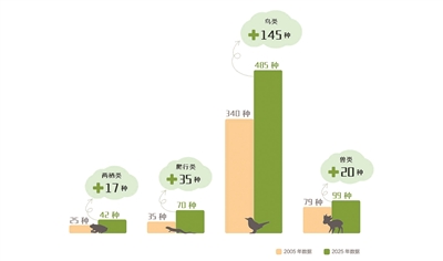 相较于2005年杭州首次陆生野生动物本底调查,最新发布的调查数据显示,陆生野生脊椎动物物种总数提升了45.3%。