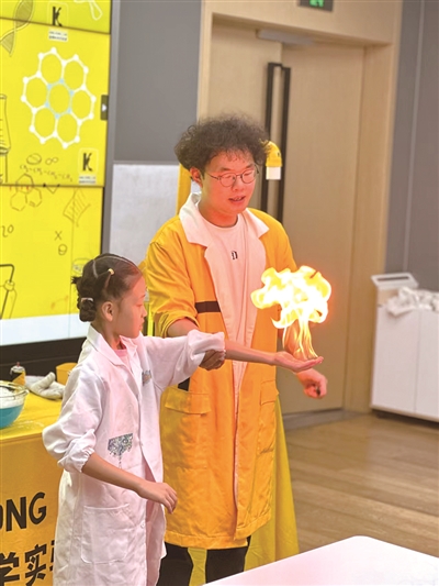 随后老师模拟动画角色做实验:把干冰放进大管子,靠一杯液体变出像海夜叉吹的大泡泡;又用蓝色水和气体罐,演示了“哪吒喷火”——点燃手上的泡沫,火冒出来后一抖就灭,手却没受伤,还请同学上台成功复刻,甚至玩起了“传火”游戏。