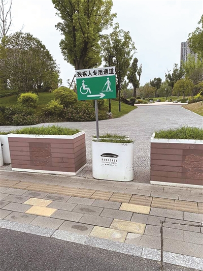 橙友“Yin”向橙柿直通车反映:走过北景园生态公园靠东新路进口,看见新装的一个指示牌很纳闷,门口安装了阻挡花箱,我沿着指示牌走,走了5分钟还是没看到指示牌所说的残疾人专用通道……