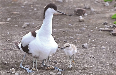 钱塘大湾区湿地的反嘴鹬宝宝和妈妈 程国龙 摄