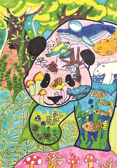 插画狮:《熊猫栖在芳丛中》杭州市北塘河小学三(9)班 易洄