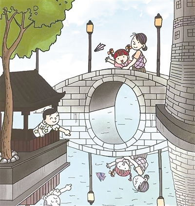 ⑤玲玲和爸爸妈妈到美丽的水乡浙江乌镇旅游。她和妈妈站在桥上,爸爸在不远处帮她们拍照。可是,这些照片里水中的倒影好奇怪,哪些倒影存在错误呢?