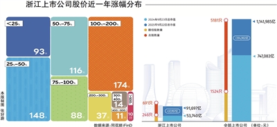 更值得一提的是,正是DeepSeek横空出世、宇树科技机器人闪耀春晚、《黑神话:悟空》席卷全球,以“杭州六小龙”为代表的浙江科技股,不仅在年初接过“政策牛”的接力棒,成为市场向上突破的主要策源地之一,直接促成了贯穿今年前9个月的“科技牛”,浙江上市公司群体自身也取得了非常亮眼的成绩,其中有246只实现股价倍增,总市值从5.37万亿元增长到9.17万亿元。