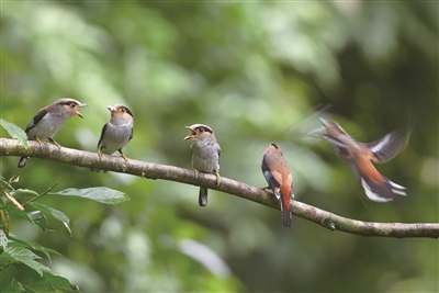 他一拍到双辫八色鸫,就会往鸟友群里发照片,手机便开始“叮叮咚咚”地响,“鸟友们会为了拍摄双辫八色鸫,立马飞过来,第二天就出现在鸟塘”。