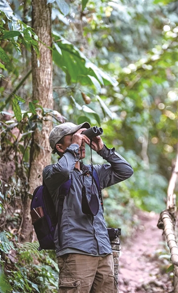 “专家手把手教我们引水造塘、布置食源,还送来了望远镜和鸟类图鉴。”飘海是村寨最先行动起来的人,并花了半年时间在雨林里追踪鸟群。最终,他在橡胶林里的一处泉眼旁建起了鸟塘,仿照自然水系挖出水塘,用竹筒引水形成小型瀑布,并在旁边撒上一些面包虫和玉米粒,吸引鸟类前来栖息。