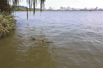 前天,西湖码头边有人发现,湖里游着两条神秘的黑色大鱼,湖面露出尖尖一角,“酷似鲨鱼”,视频照片迅速在网上热传。