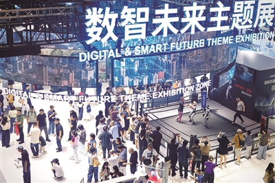 第四届数贸会的展陈空间达15.5万平方米,设置了一个数贸主题展馆以及人工智能、数字文娱、数智出行等七大特色展区。